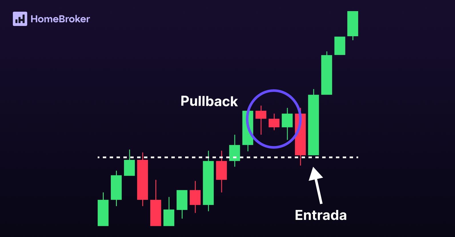 O preço sobe em tendência de alta, retorna até a linha de tendência (pullback) e, exatamente nesse ponto, aparece uma vela verde forte. A união desses fatores cria um ponto de entrada com maior confiança.