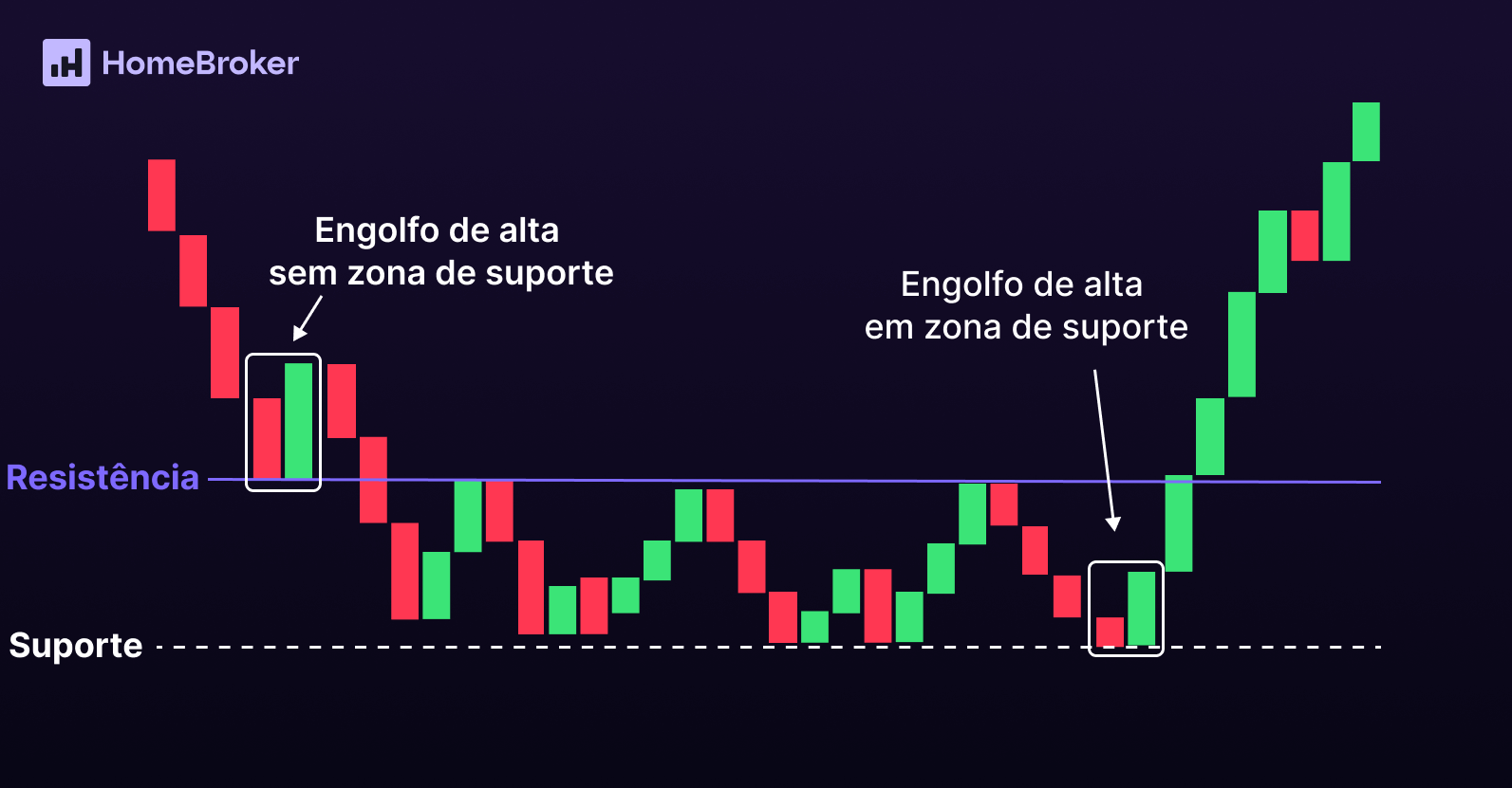 À esquerda, uma entrada baseada apenas em uma vela de rejeição, sem apoio de outros fatores. À direita, o mesmo padrão de vela aparece, mas em confluência com uma zona de suporte e retorno ao ponto de interesse. A segunda entrada tem muito mais consistência.