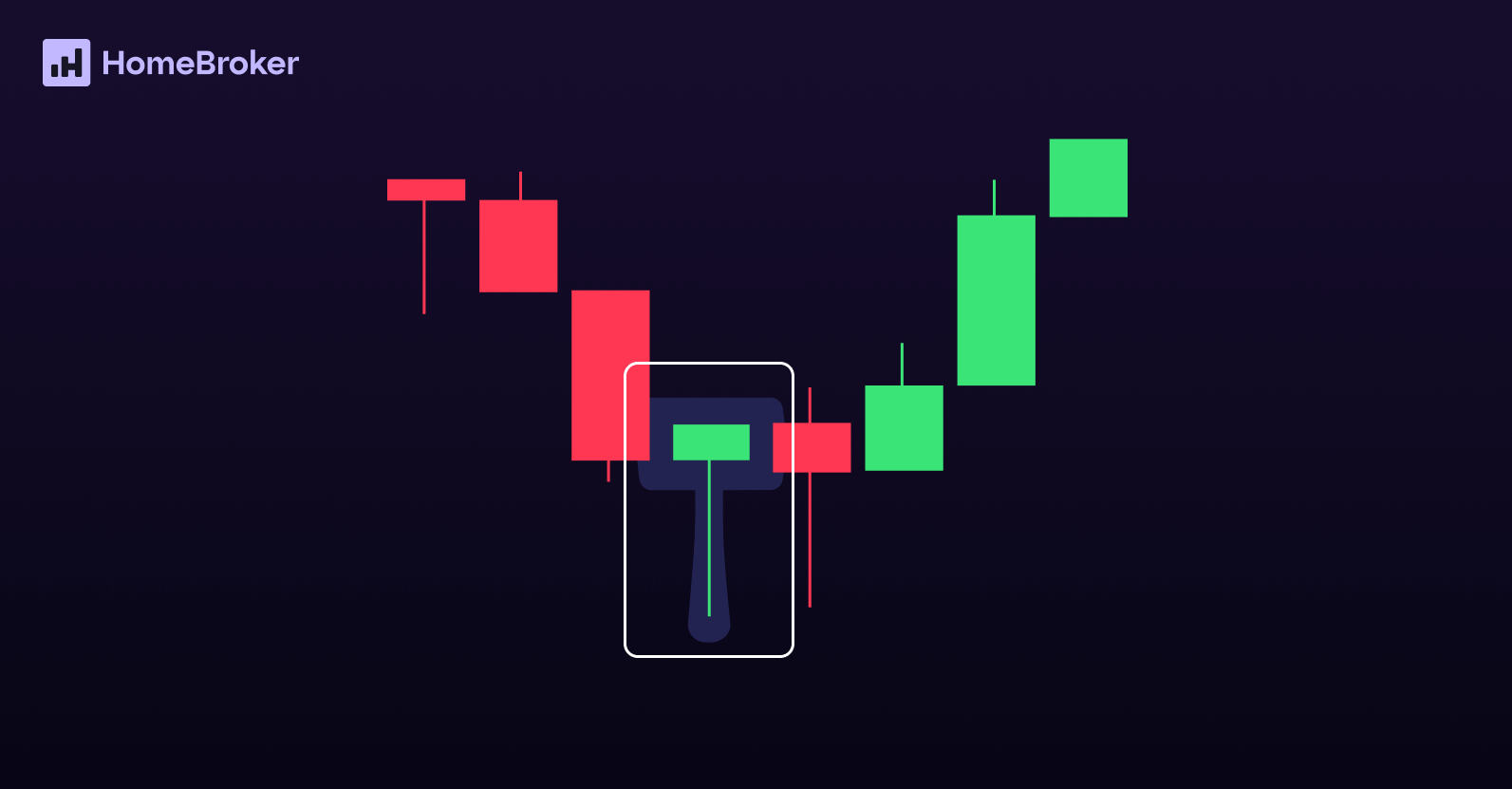 O Martelo é um padrão de reversão de baixa para alta. Ele aparece depois de uma sequência de velas de queda e indica que o preço tentou continuar caindo, mas os compradores entraram com força, empurrando o preço de volta para cima.
