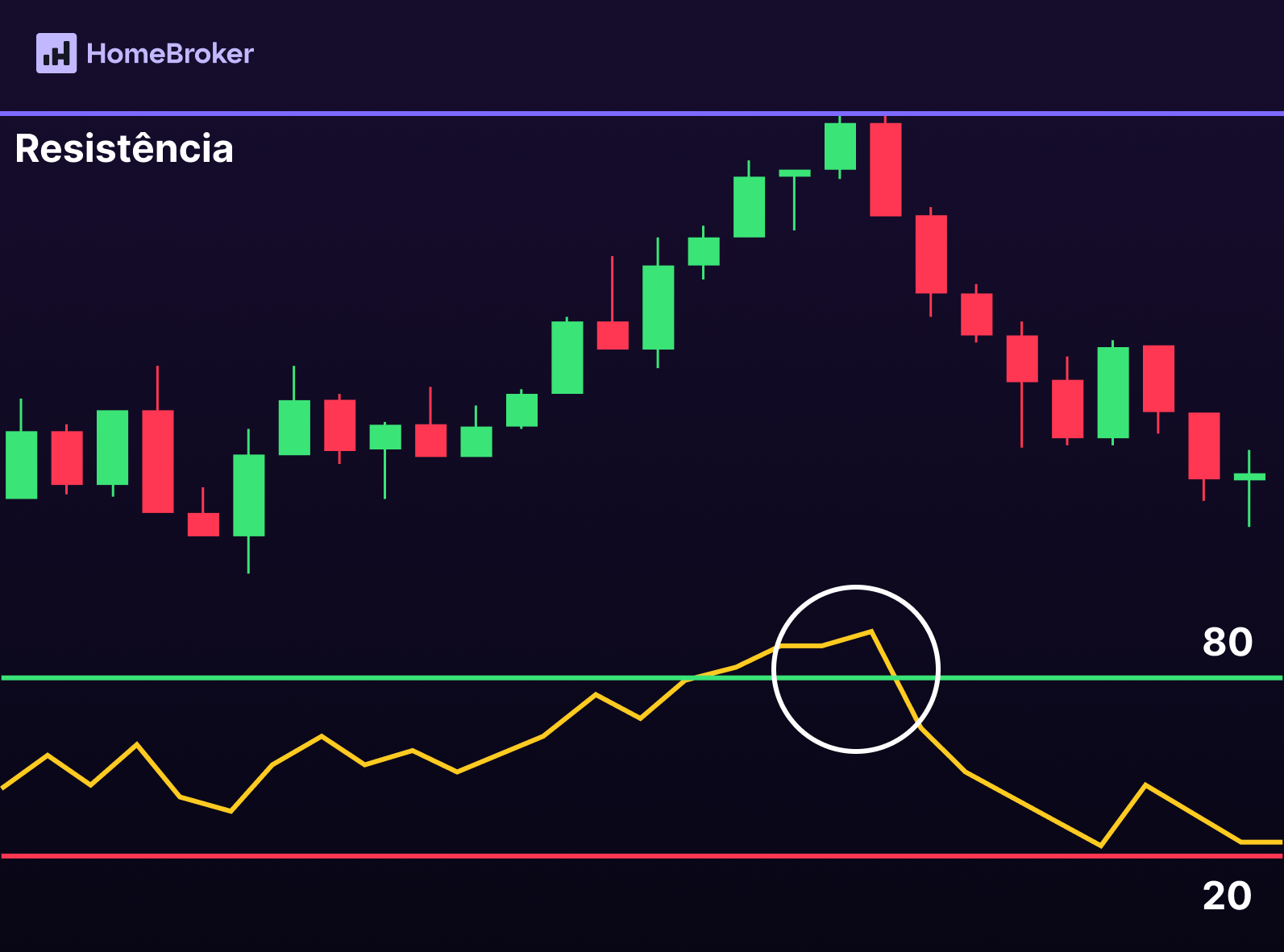 - Quando cai abaixo de 30, pode indicar oportunidade de retorno para cima.