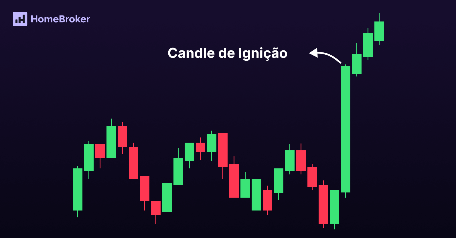 A vela de ignição é o “motor ligado” do movimento. Ela mostra entrada forte de players institucionais ou grandes volumes posicionando-se em uma direção.